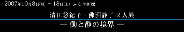 2007年10月8日〜13日、新進の洋画家・清田悠紀子 (30) と気鋭の日本画家・佛淵静子 (33) の2人展が開催される。無所属で、東京を拠点に活動し、人物を主なモチーフに制作する2人は、洋画と日本画という枠を超え、真実から乖離した過剰な表現を廃し、シンプルな表現で本質を追究するという点で一致。人物そのものの描写を追究することによって、対象を取り巻く空気感を表現できると考えている。S100号を中心に、小品を含め、各々が新作7〜8点を出品予定。